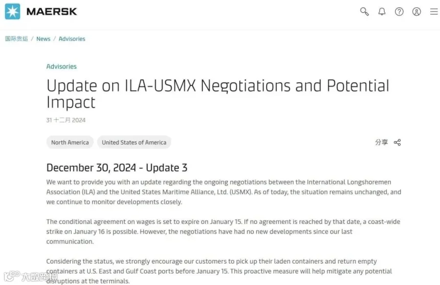 马士基集团在周二发布的一份客户通知中明确指出,鉴于码头工人与雇主美国海运联盟(USMX)之间的谈判僵局,如果双方在1月15日之前未能达成协议,那么1月16日沿海地区爆发罢工将成为可能。