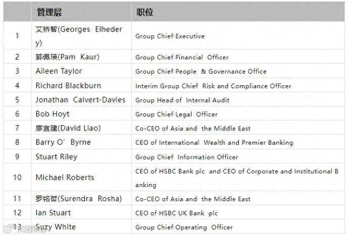 HSBC汇丰控股官网显示,其最高决策层由原来的19人缩至13人。
