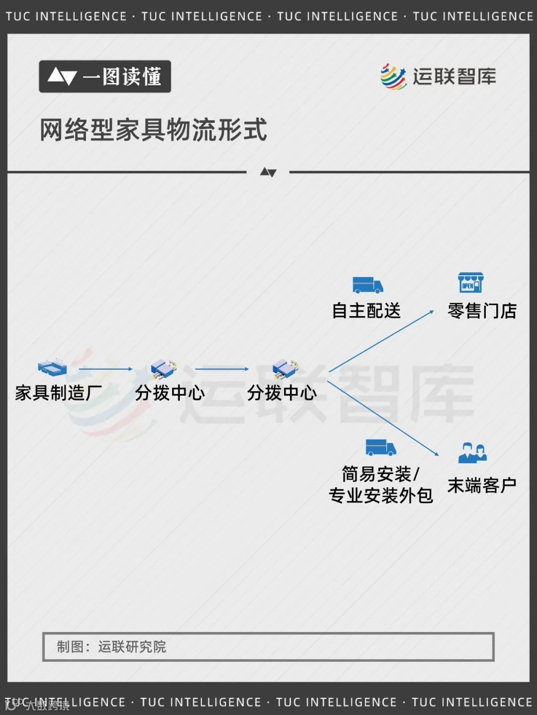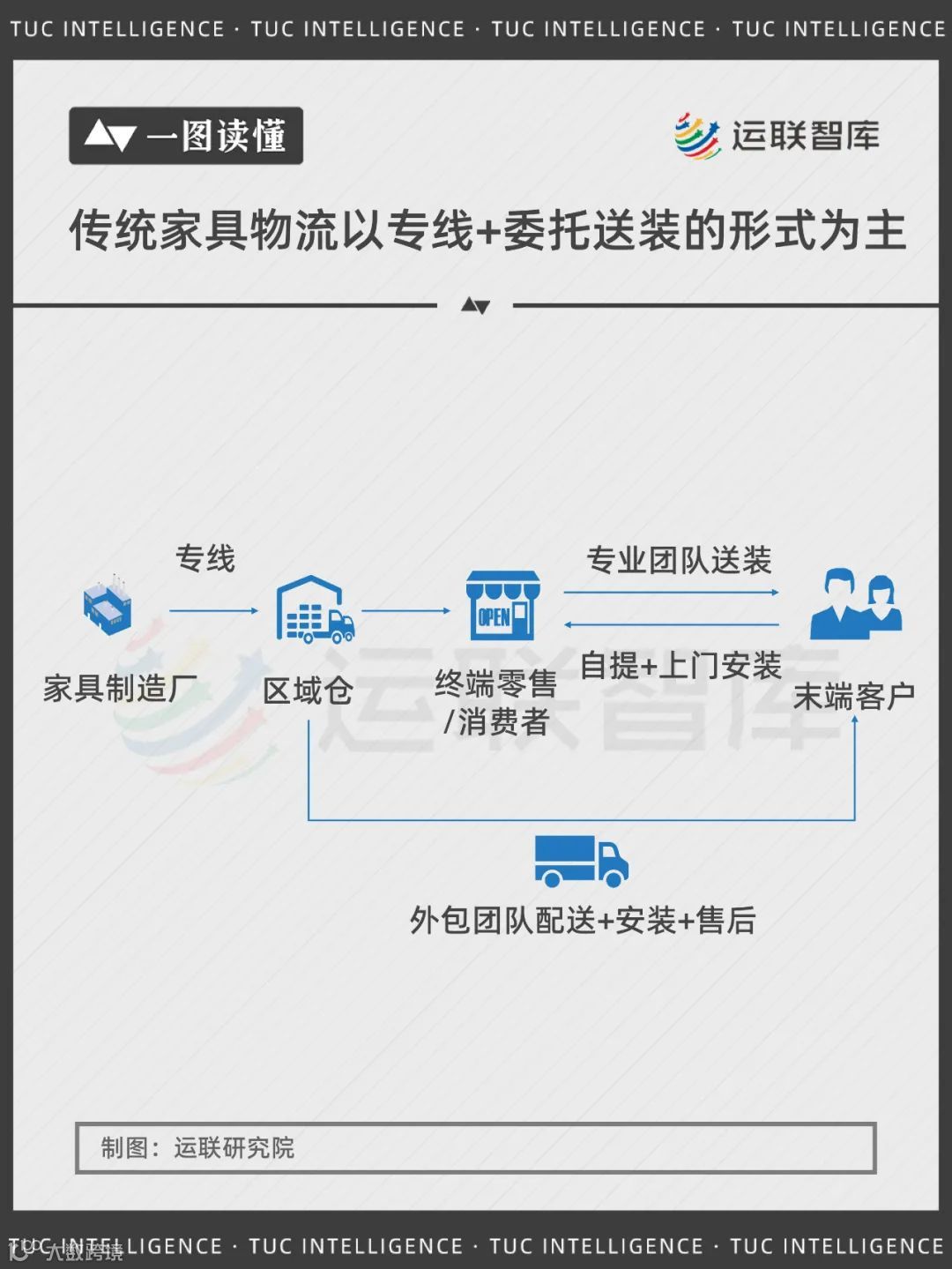 传统经销渠道,主要服务于B端的家具经销商。其物流模式主要是,专线企业从家具生产商处直接将家具送至销售地城市区域仓库,然后配送团队根据门店/卖场需求进行配送,运作流程相对单一。