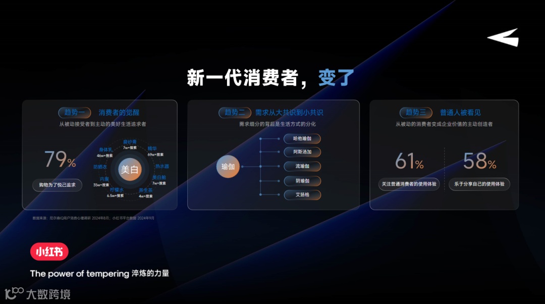 第一,用户变得越来越喜欢、也越来越会做功课。举个例子,用户在购买一款美白产品前,会进行上百次搜索,涉及场景、品类、功效、品牌等各种方面。这表明消费者变得非常明智、主动,并且具备辨别力。