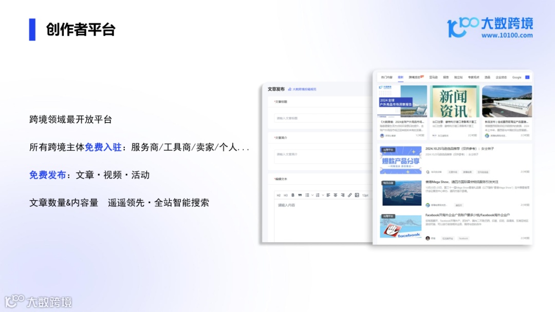 大数跨境致力打造跨境领域最开放的内容创作平台,欢迎所有跨境主体(服务商、工具商、卖家和个人等)免费入驻。