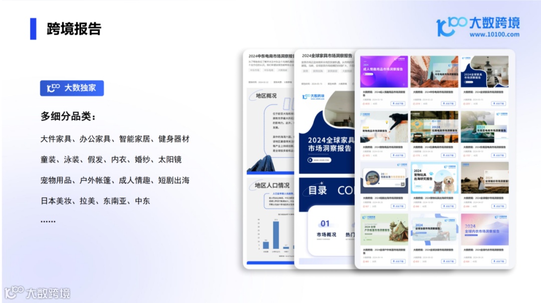 大数独家报告涵盖大件家具、智能家居、健身器材、宠物用品、美妆、短剧出海等多个细分领域;聚焦全球市场,包括日本、拉美、东南亚和中东等。用户可以通过邀约积分免费获取报告,及时掌握最新市场趋势与数据洞察,助力企业决策与业务发展。