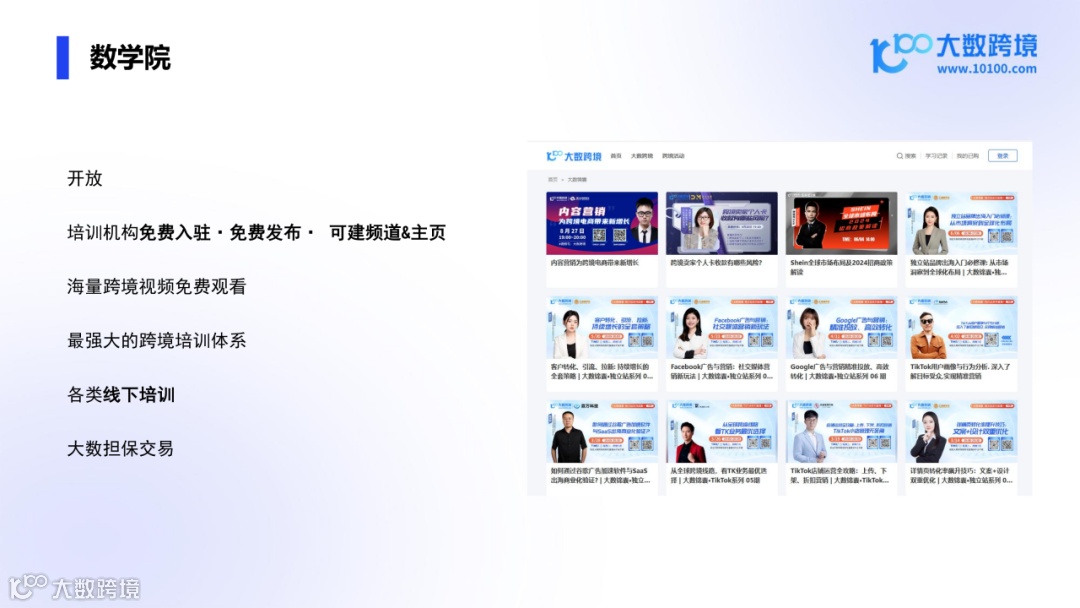 数学院是大数跨境致力打造的跨境电商领域最开放的培训平台,培训机构可免费入驻并发布内容,支持创建频道和主页。