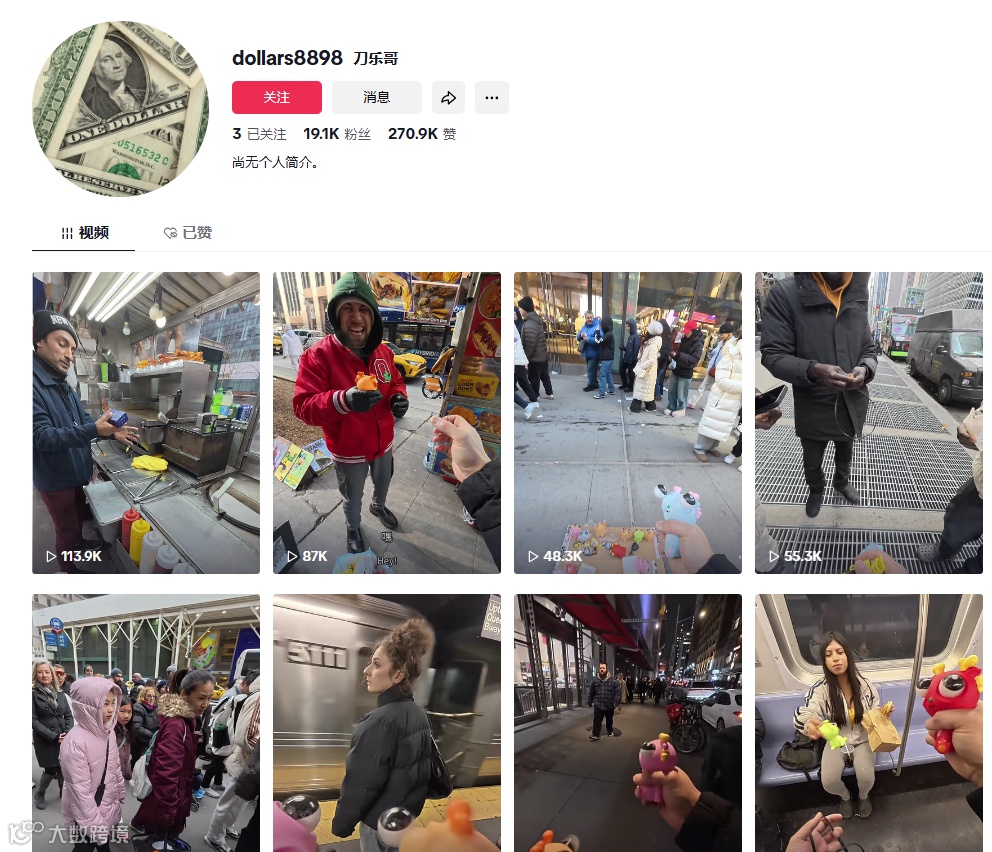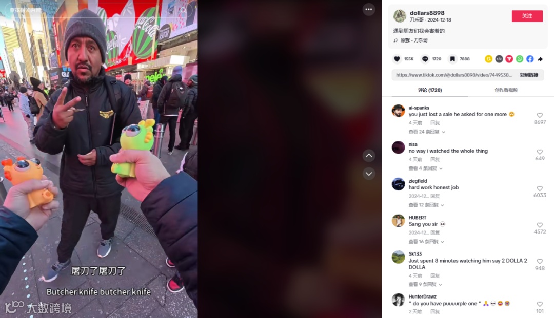 大数跨境(10100.com)观察,这一切源于一名中国网红“刀乐哥”。在纽约时代广场,刀乐哥采用第一人称视角,手握“爆眼龙”捏捏玩具,穿梭于熙攘人群之中,用极为有限的英文词汇“吐刀乐(Two dollar)、吐刀乐(Two dollar)”吸引过往行人目光,引得无数路人驻足购买。