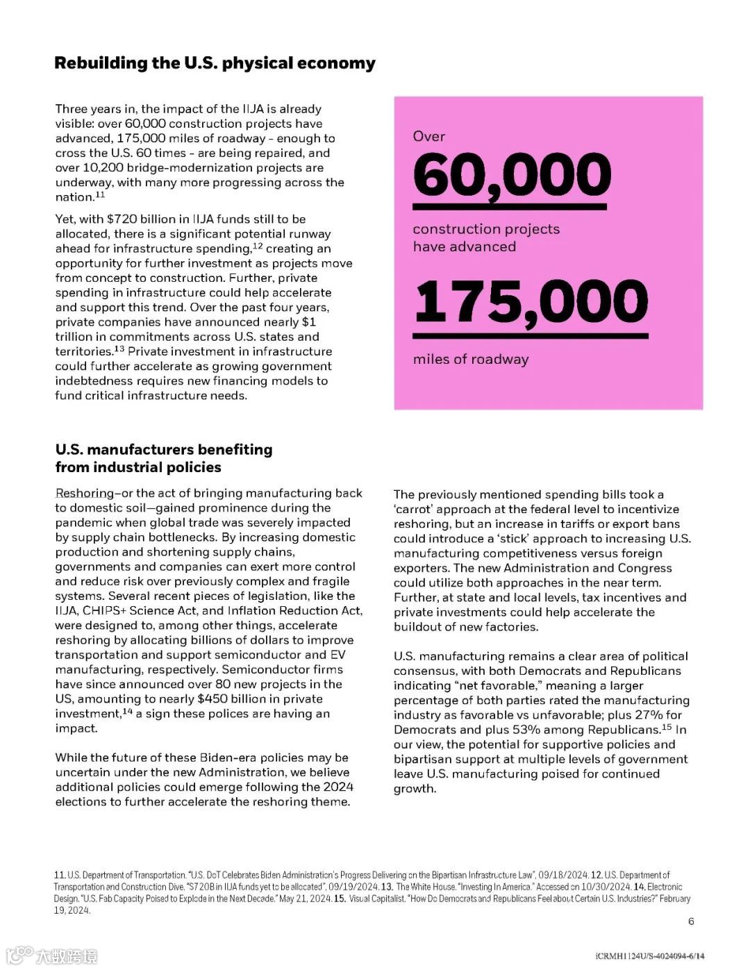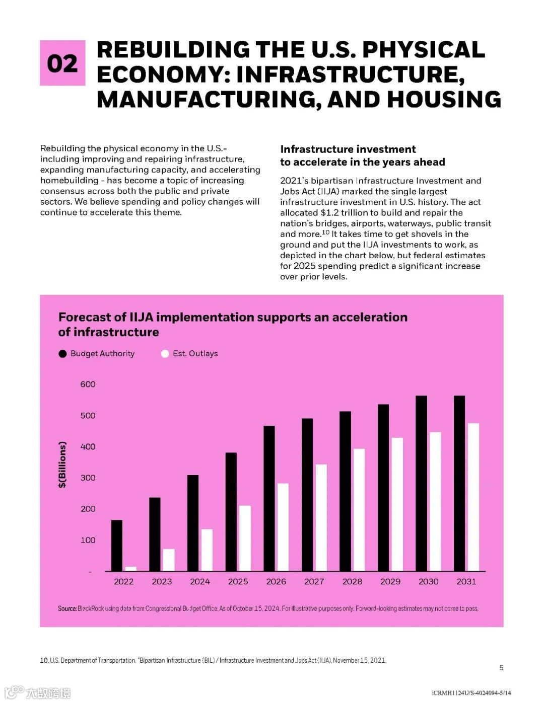 2021年通过的《基础设施投资和就业法案》(ILJA)为美国基础设施注入了1.2万亿美元的资金。截至2024年,已有6万个建设项目启动,17.5万英里的道路和1.02万座桥梁正在修复中。然而,仍有7200亿美元的资金尚未分配,这意味着基础设施投资将在2025年继续加速。