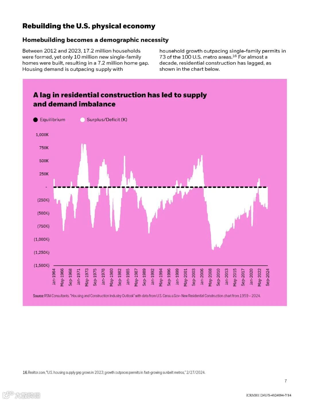 住房建设则是另一个关键领域。2012年至2023年间,美国形成了1720万户家庭,但仅建造了1000万套独户住宅,导致720万套的供需缺口。随着千禧一代成为美国最大的购房群体,住房需求将持续增长。报告预测,2025年住房建设将加速,尤其是在利率下降和地方政府政策支持的背景下。