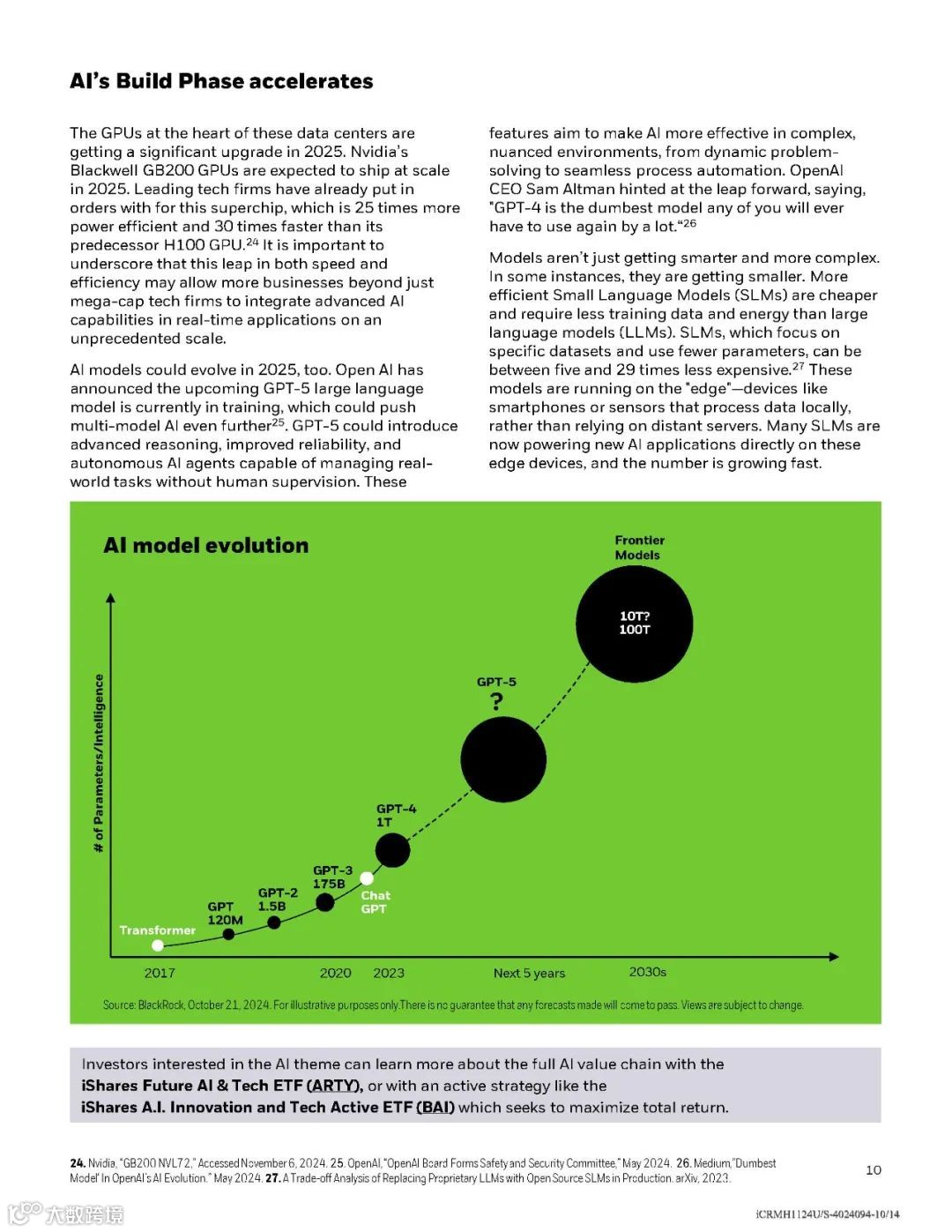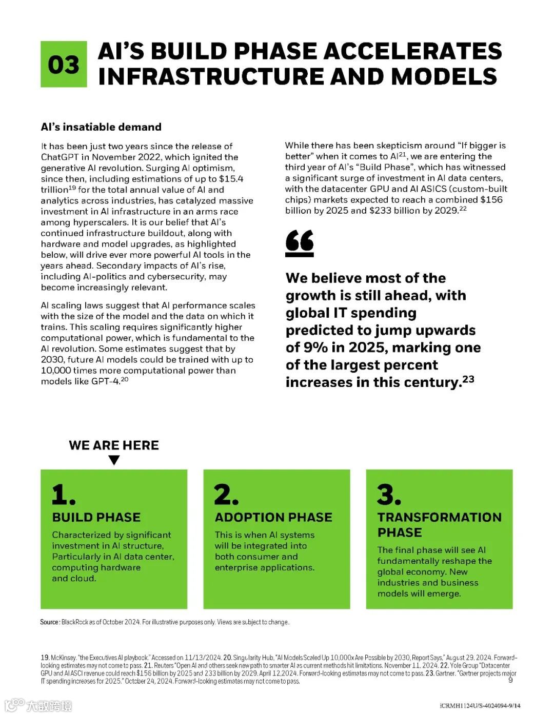自2022年ChatGPT发布以来,生成式AI引发了全球范围内的技术革命。报告指出,AI的“建设阶段”正在加速,2025年全球IT支出预计增长9%,创下本世纪最大增幅之一。AI模型的性能随着数据量和计算能力的提升而增强,预计到2030年,AI模型的计算能力将比GPT-4高出1万倍。