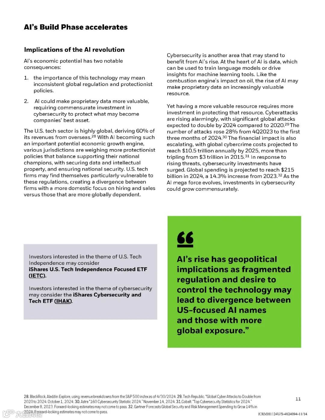 AI的快速发展也带来了新的挑战。数据安全和全球监管成为焦点。报告预测,2025年全球网络攻击将比2020年翻倍,网络犯罪成本预计达到10.5万亿美元。为应对这一威胁,全球网络安全支出预计在2024年达到2150亿美元,同比增长14.3%。
