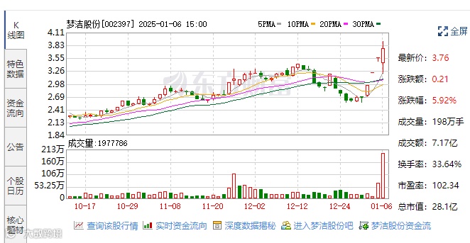 2025年1月6日,梦洁股份上演“地天板”行情,低开3.1%后迅速砸至跌停,随后又迅速拉升封至涨停。截至1月6日,梦洁股份收盘价为3.76元/股。其暴涨可能与以下因素有关: