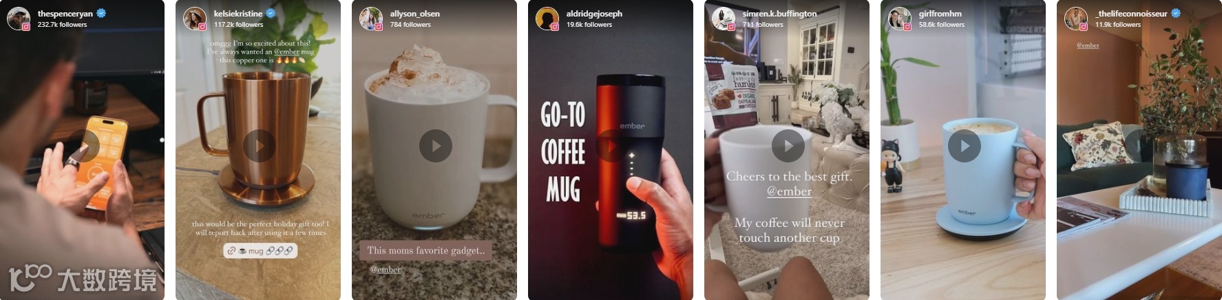 红人营销:Ember与大量的Instagram红人进行合作,发布推广视频,并将红人录制的视频放到了网站首页。我们会发现其所合作的红人,既有粉丝量几十万的中腰部红人,还有几百的小微红人。