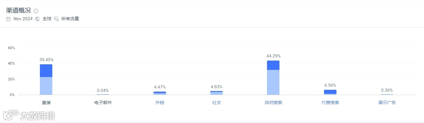 根据similarweb数据显示,Ember官网的流量主要来自于自然搜索流量(44.29%)、直接访问流量(39.45%)、付费搜索(6.56%)、社交媒体(4.83%)。