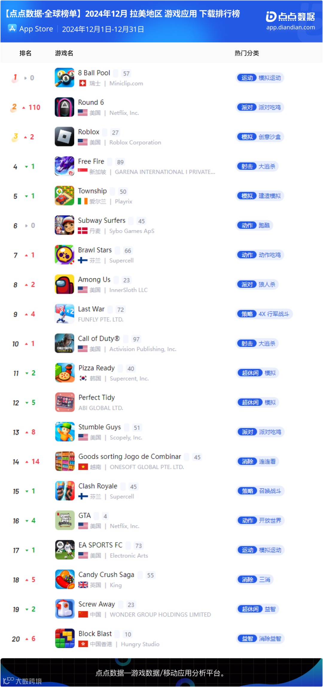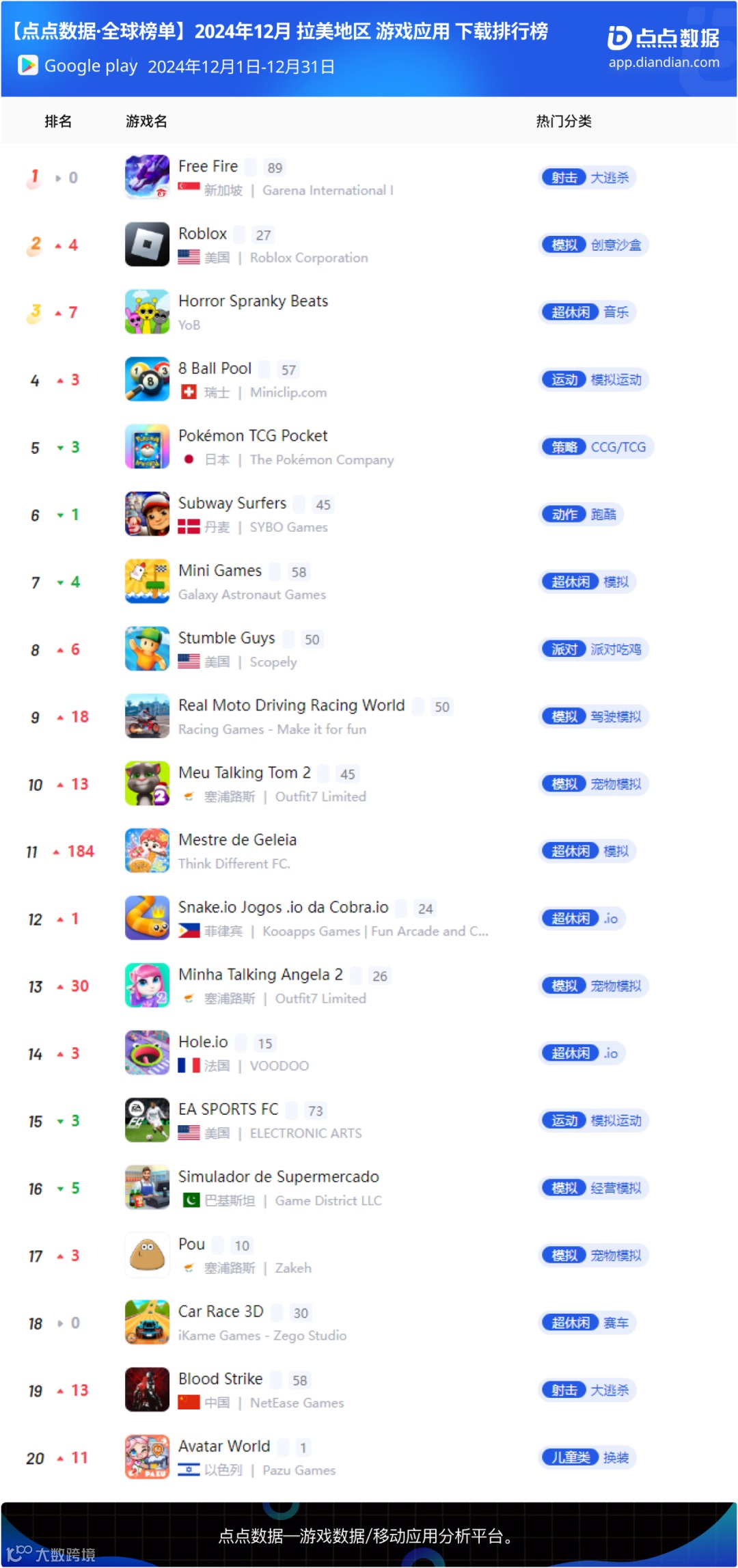 12月拉美地区手游下载榜Top20