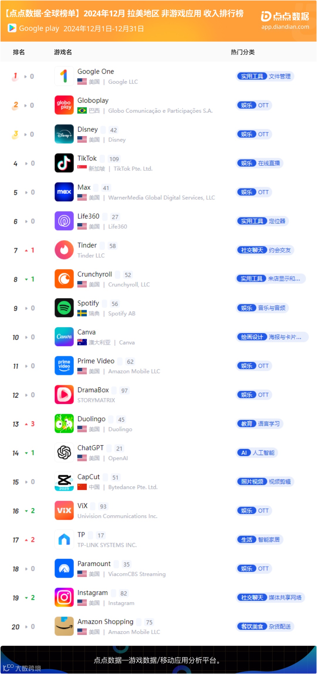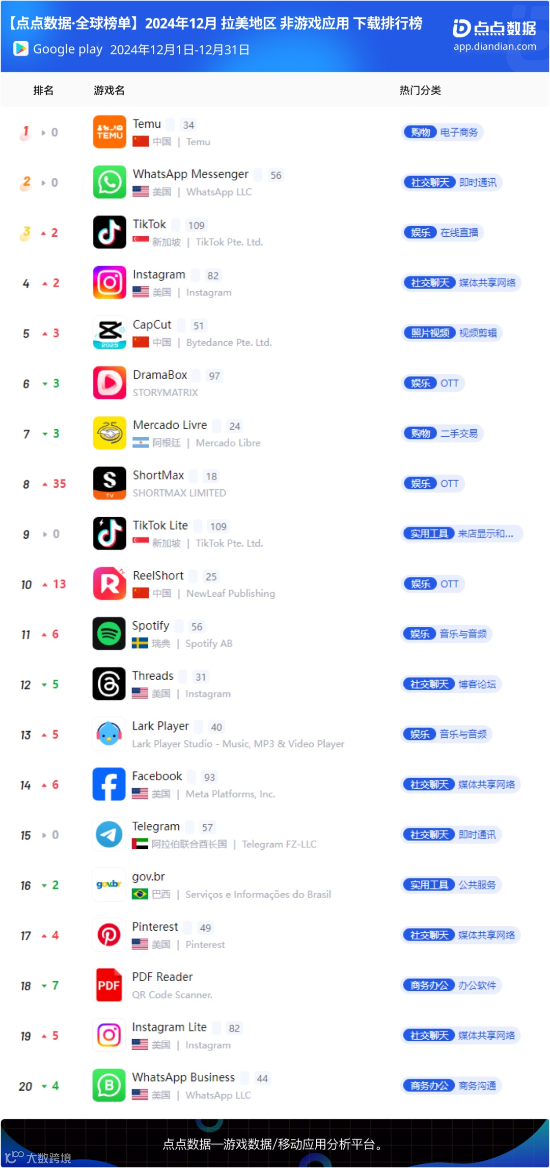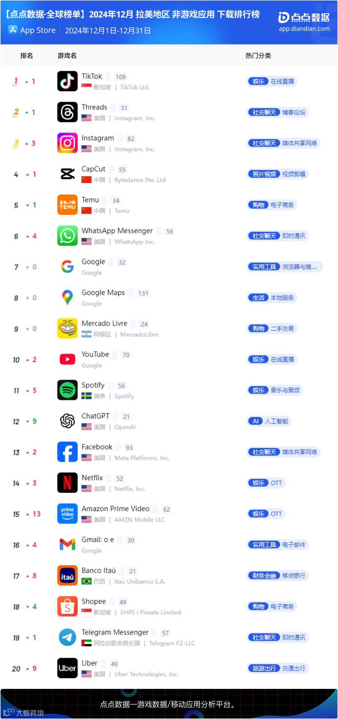12月拉美地区应用下载榜Top20