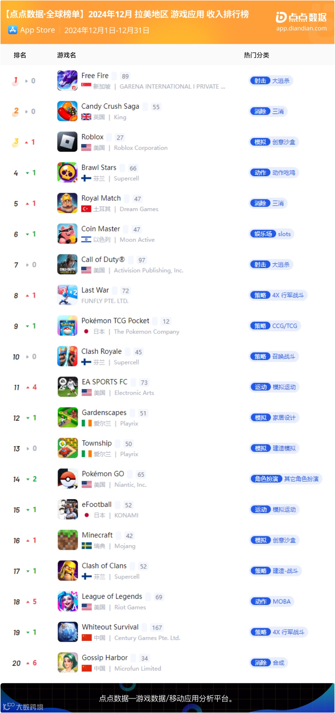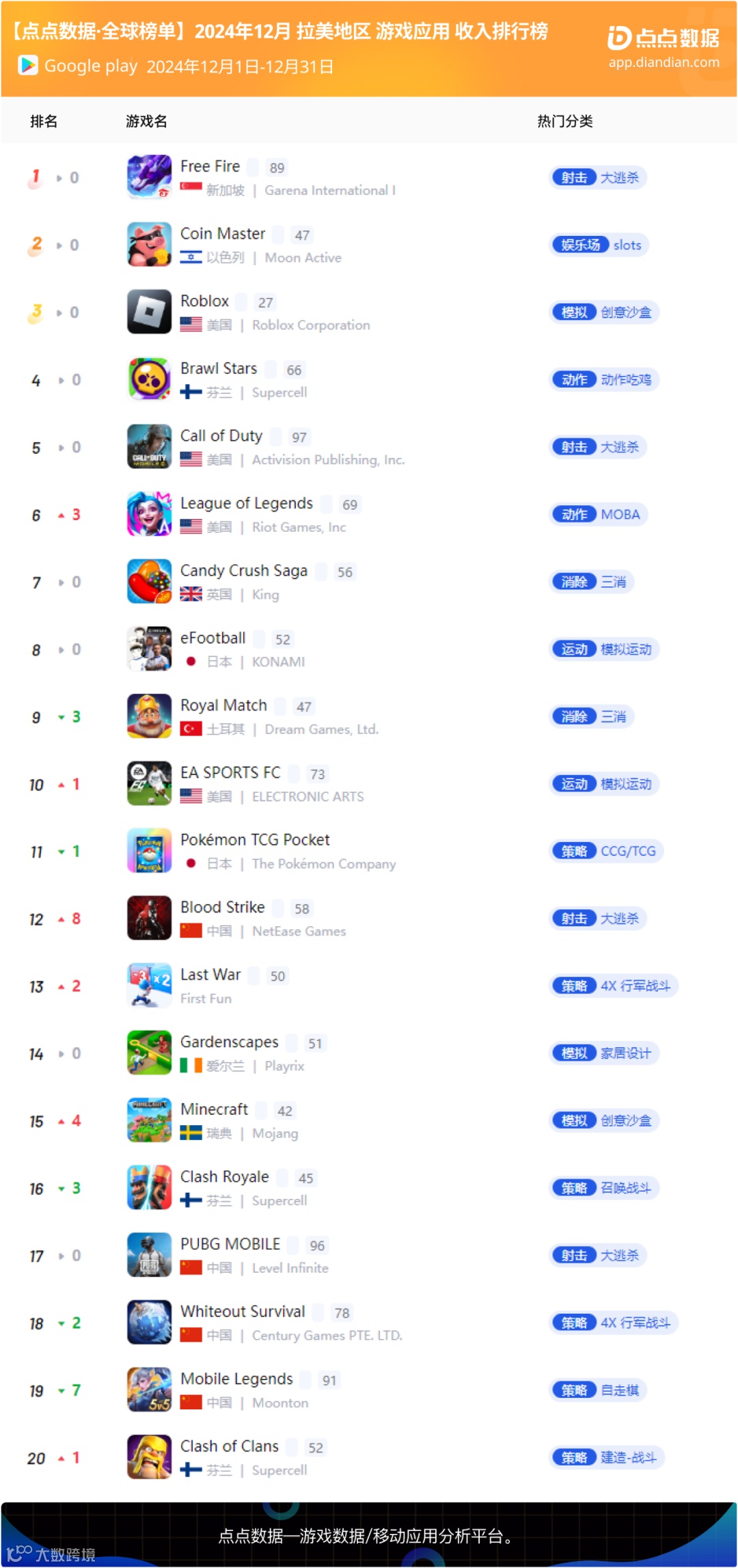 12月拉美地区手游收入榜Top20