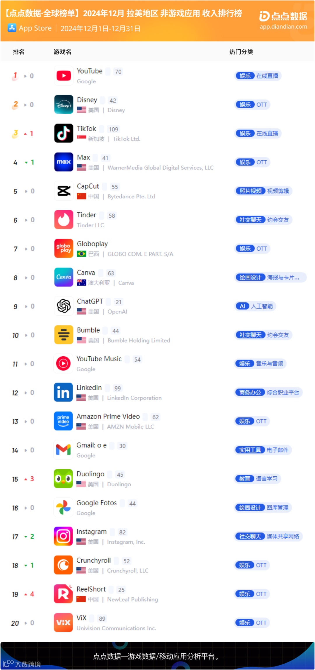 12月拉美地区应用收入榜Top20