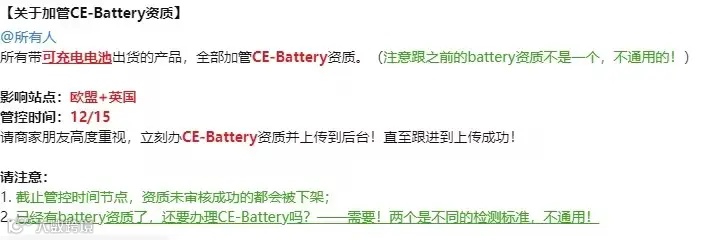 2024年12月15日之前:所有涉及电池的产品,必须确保提供有效的CE认证和相关合规文件。如果未在此日期前完成上传,相关产品将无法继续销售,甚至可能会被下架。