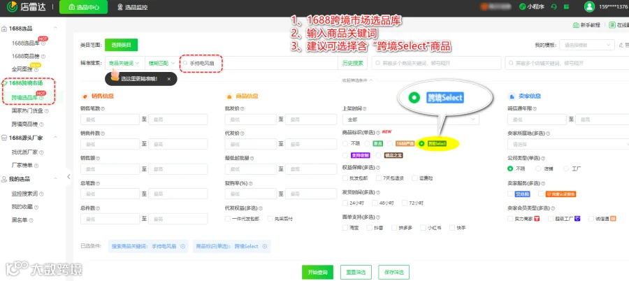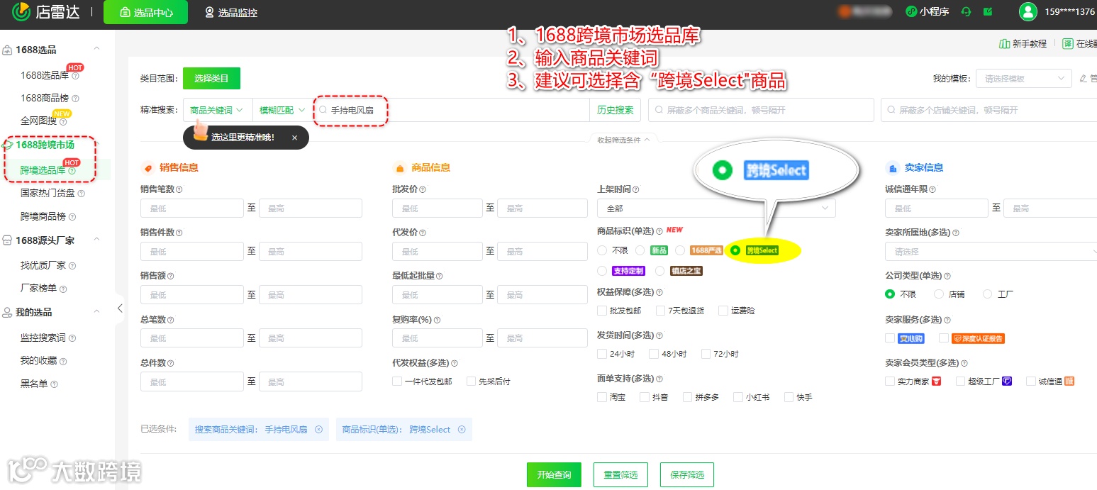 较轻和较小的商品可以降低运输成本,特别是在按重量或体积计费的情况下。通过店雷达1688跨境市场选品库,选定想要的商品,建议选择“跨境Select"商品,查看近期销量增长迅速的轻便小巧产品。如迷你手持风扇、便携式榨汁杯、小型加湿器等,这些产品因方便携带和使用,在市场上广受欢迎,且运输成本相对较低。