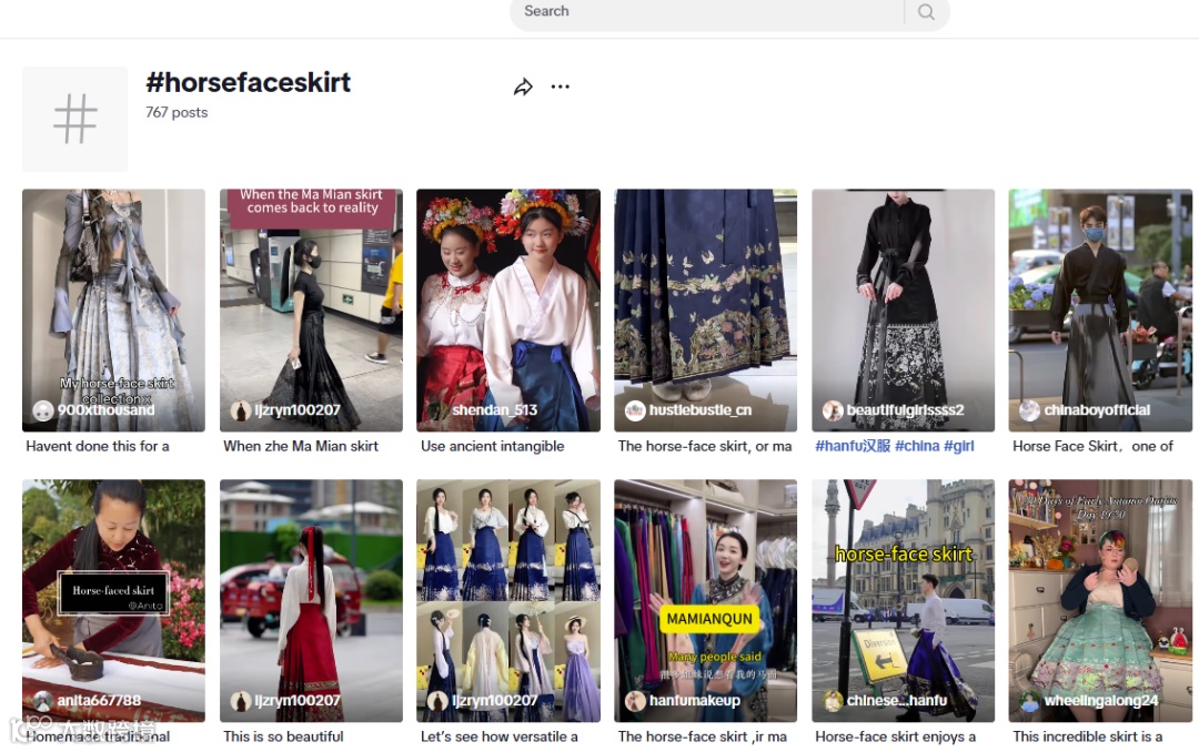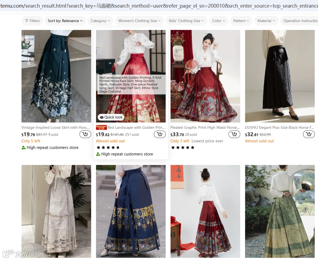 今年3月底,中国日报官方TikTok账号还发布不同颜色花纹马面裙在不同场景下的效果展示,收获一众好评。Tik Tok上#horse-face skirt(马面裙)标签相关视频虽仅767条,但视频播放量达几十万甚至几百万,海外用户身着马面裙走在街头备受关注,马面裙成为海外最新时尚单品。图源:TikTok在海外城市街头,身着马面裙的女孩越来越多,她们不仅仅在大型节日身穿汉服,甚至已经成为一些人的日常着装。就连戴安娜王妃,也曾在出席正式活动时身着中国马面裙,提高马面裙在海外知名度。大数跨境(10100.com)观察,目前Amazon、Temu、Etsy上均有马面裙售卖,直接搜索“horse face skirt”,可以发现产品售价均在20美元左右,印有代表中国文化的符号,如汉字、中国结、京剧脸谱的马面裙更受海外消费者喜爱。图源:Temu除TikTok外,Instagram、Facebook等平台也有博主通过展示马面裙的材质、剪裁及穿搭等方式,吸引更多海外用户。中国人在海外展示马面裙的魅力,也吸引了海外消费者的购物欲,在海外电商平台,马面裙销量迎来大增长。杭州一位卖家表示马面裙过去一整年销量都很可观,每次订单量都在几千件,不像其他服饰产品会受到季节性影响。