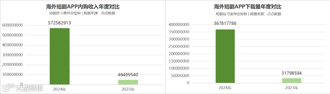 短剧APP疯狂吸金,内购收入飙升至5.7亿美元,比2023年的4650万美元翻了12倍不止,下载量也从3179.9万次猛增至3.7亿次。