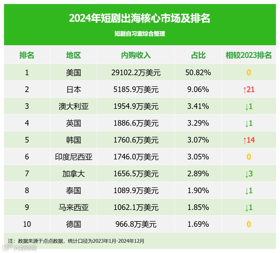 根据2024年全年数据,短剧APP内购收入前十名地区依次是美国、日本、澳大利亚、英国、韩国、印度尼西亚、加拿大、泰国、马来西亚、德国。其中美国地区占比高达50.82%。