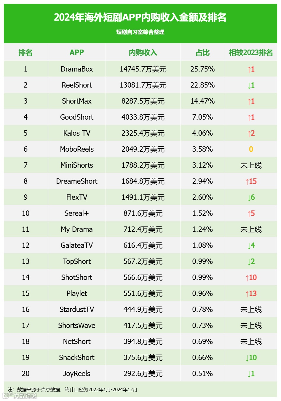 与2023年的排名对照来看,前六名变动不大,DramaBox和ReelShort交替收揽冠军,新秀表现突出,如MiniShorts是2024年上线的APP,也登上前10席位。