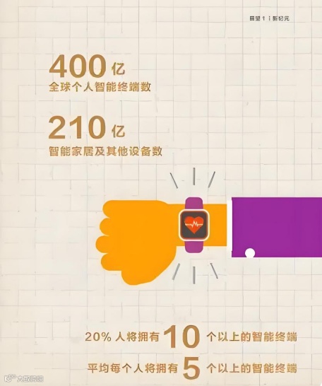 《GIV 2025打开智能世界产业版图》则预计,2025年全球智能终端数将达400亿 ,智能家居及其他设备将达210亿。其中智能手机数将达80亿,平板和PC电脑将达30亿,各类可穿戴设备数达到80亿,平均每人将拥有5个智能终端,20%的人将拥有10个以上的智能终端;近200亿实时在线的智能家居设备,将成为个人和家庭感知的自然延伸。