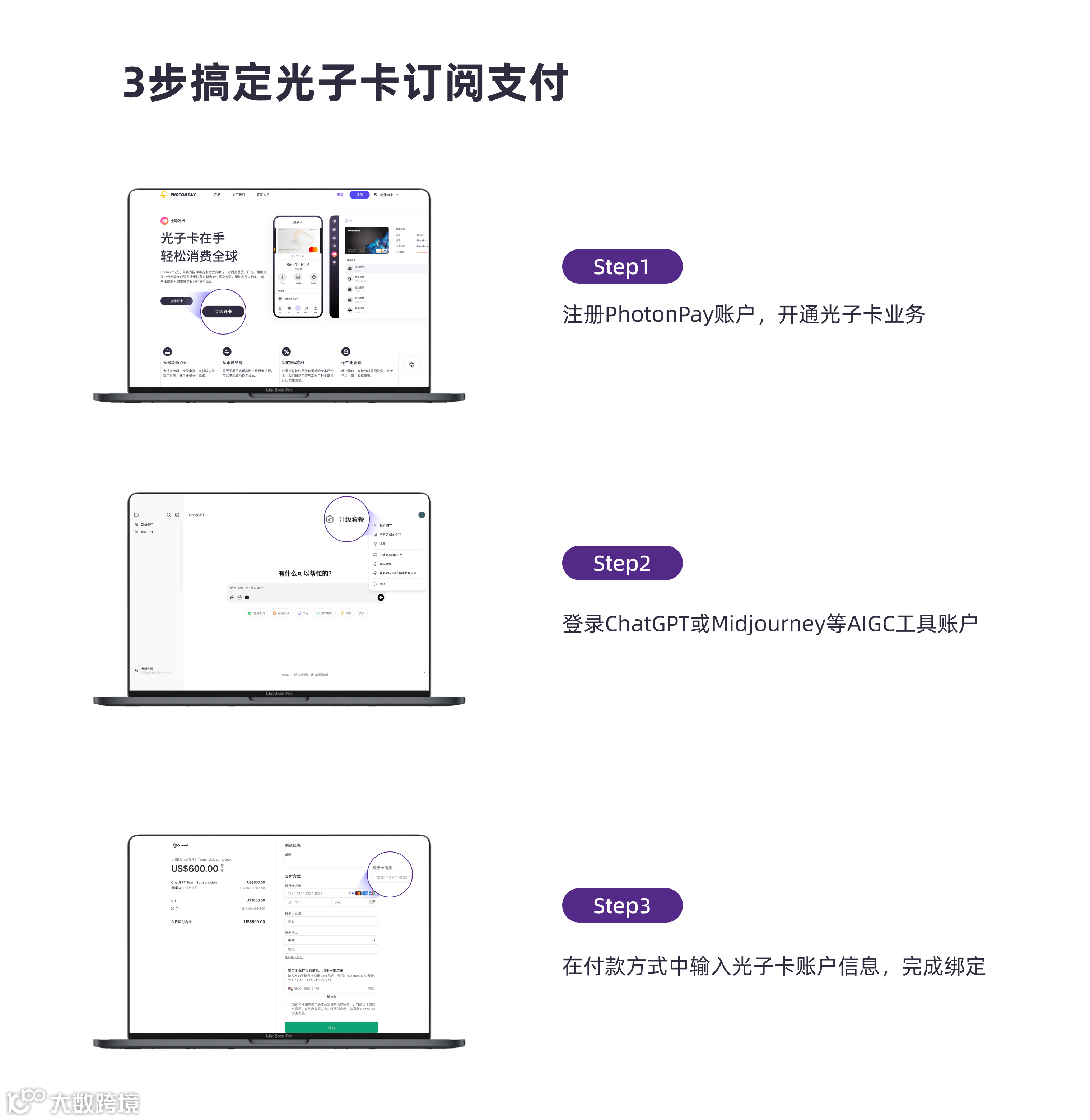 凭借其便捷的消费流程、卓越的安全保障和高效的费用管理体验,为企业提供了一个轻松实现信用卡订阅或续费AI工具服务的支付解决方案,确保支付过程更加稳定、顺畅。只需简单几步,企业即可畅享无忧的订阅类支付体验:首先,注册PhotonPay账户,开通光子卡业务。然后登录您ChatGPT或Midjourney等AIGC工具账户,点击升级计划,进入付费版本订阅支付页面。在付款方式中选择“绑定信用卡”选项,输入光子卡卡号、姓名、账单地址等信息,即可完成绑定。