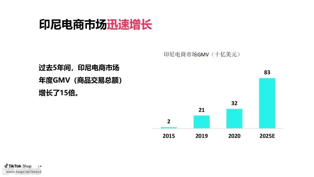 TikTok Shop之所以把印尼作为东南亚的小店首站,除了印尼是东南亚第一人口大国外,更是因为2021年印尼电商市场规模已达530亿美元,远超第二名马来西亚的140亿美元。
