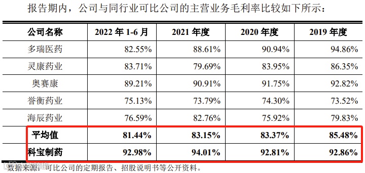 公司主营产品毛利率分别为92.86%、92.81%、94.01%及92.98%,明显高于可比公司平均值。