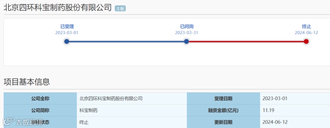 6月12日,上交所发布公告,终止对北京四环科宝制药股份有限公司主板IPO的审核。该决定直接由公司及保荐机构中信建投主动撤回申报所致。四环科宝原计划通过本次IPO募资11.19亿元。