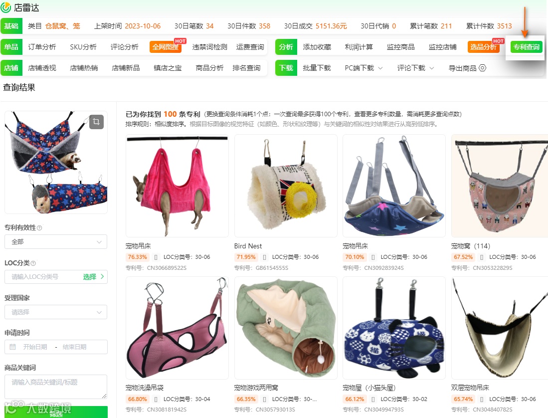 进一步对供应商交易数据、出单量、回头率、响应率等指标进行深度筛选,找到相对稳定的供应链。最后要注意品牌侵权相关问题,可向供应商沟通中获取品牌授权等相关资质,结合店雷达专利查询功能,返回相似度,提前规避外观专利侵权风险。