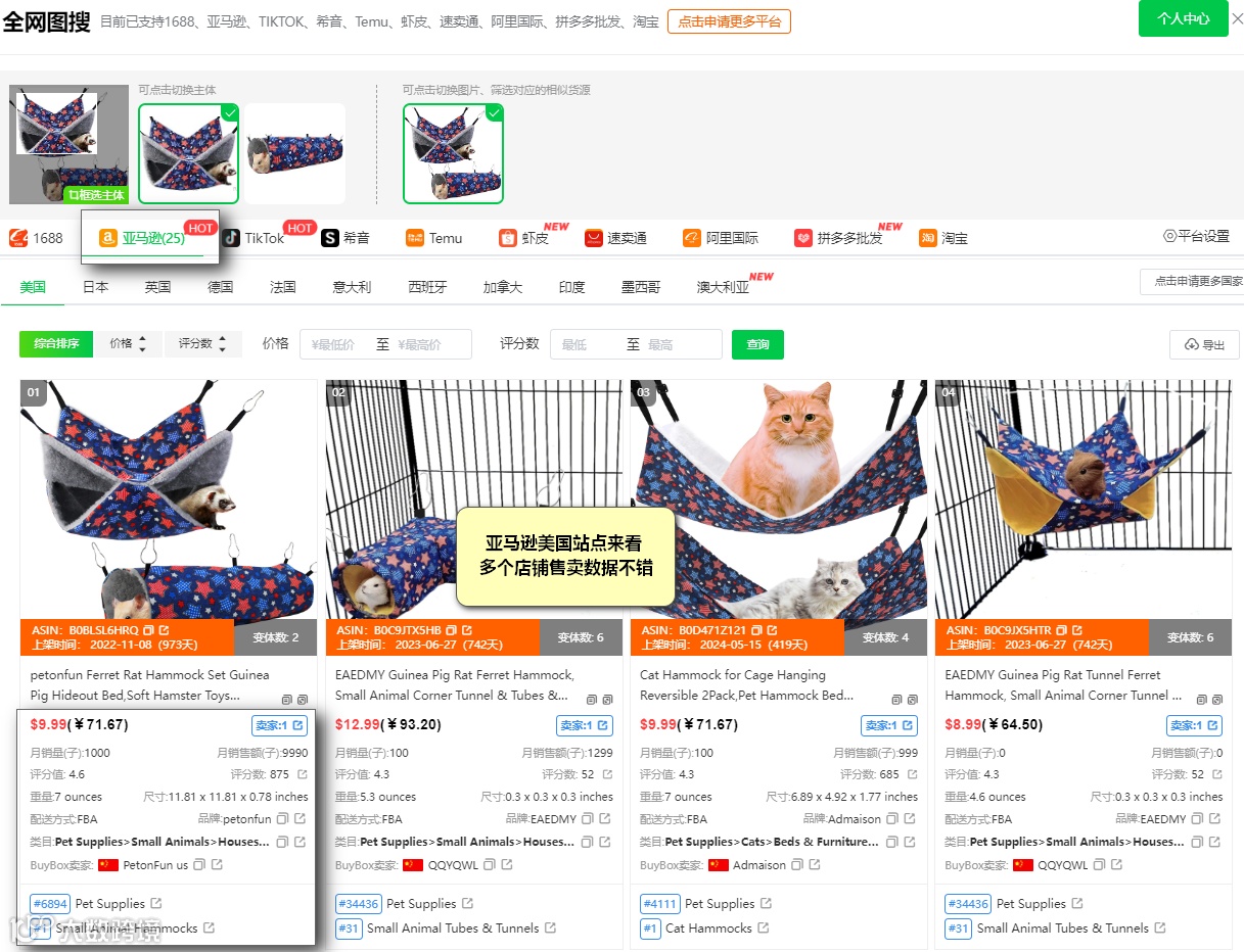 再用店雷达全网图搜快速查询到亚马逊、Tiktok、shopee等多个热门跨境平台上同款或相似商品的销售情况、价格对比等信息。亚马逊美国站点来看这款小动物吊床,多个店铺售卖数据不错,有的店家月销能达1000+,在Tiktok平台上却尚未形成热卖趋势。