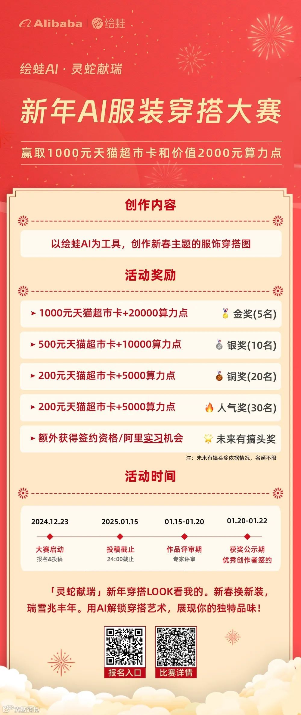 参与绘蛙「灵蛇献瑞」·新年服装穿搭大赛将有机会赢得千元天猫超市卡、丰富算力点及阿里巴巴实习机会