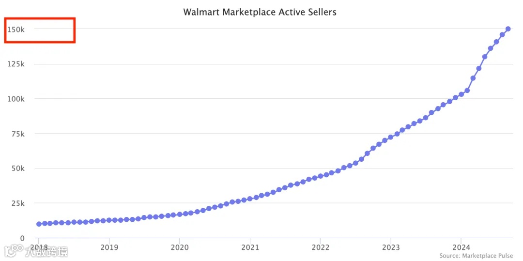 另据全球电商情报机构Marketplace Pulse发布的最新数据显示,在过去12个月里,沃尔玛的活跃卖家数增长了5万多名,增幅占据了卖家总数的半壁江山。