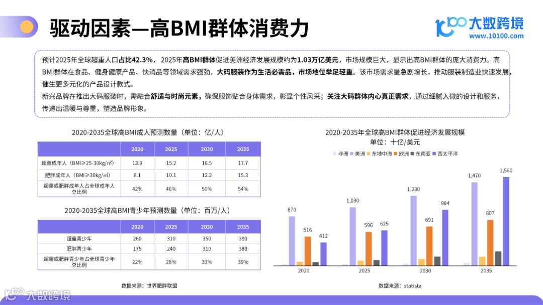 随着全球超重人口持续增长,预计到2025年高BMI群体将推动美洲经济达1.03万亿美元,展示出强大的消费潜力。大码服装市场作为生活必需品,需求迅速增长,推动服装产业多样化发展。