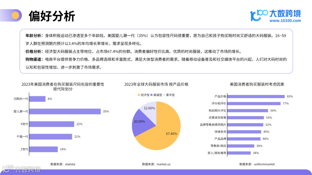 美国婴儿潮一代(35%)偏爱时尚舒适的大码服装。16~59岁群体需求多样,年均增长3.4%。经济型大码服装占67.4%市场份额,消费者倾向性价比高的优质产品。