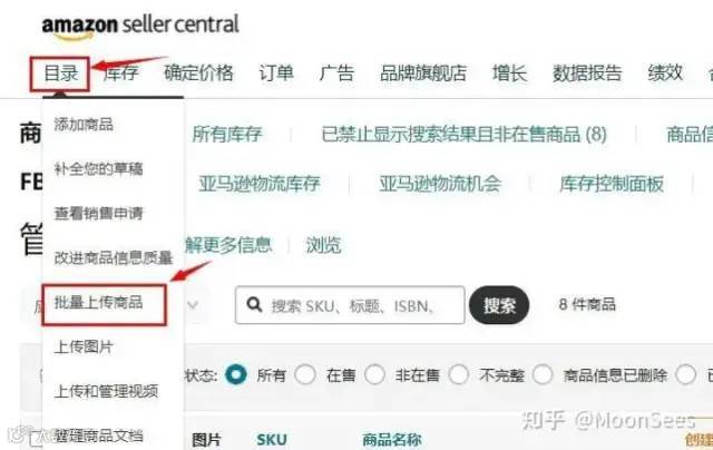 步骤一:打开亚马逊卖家后台,找到目录——批量上传商品。