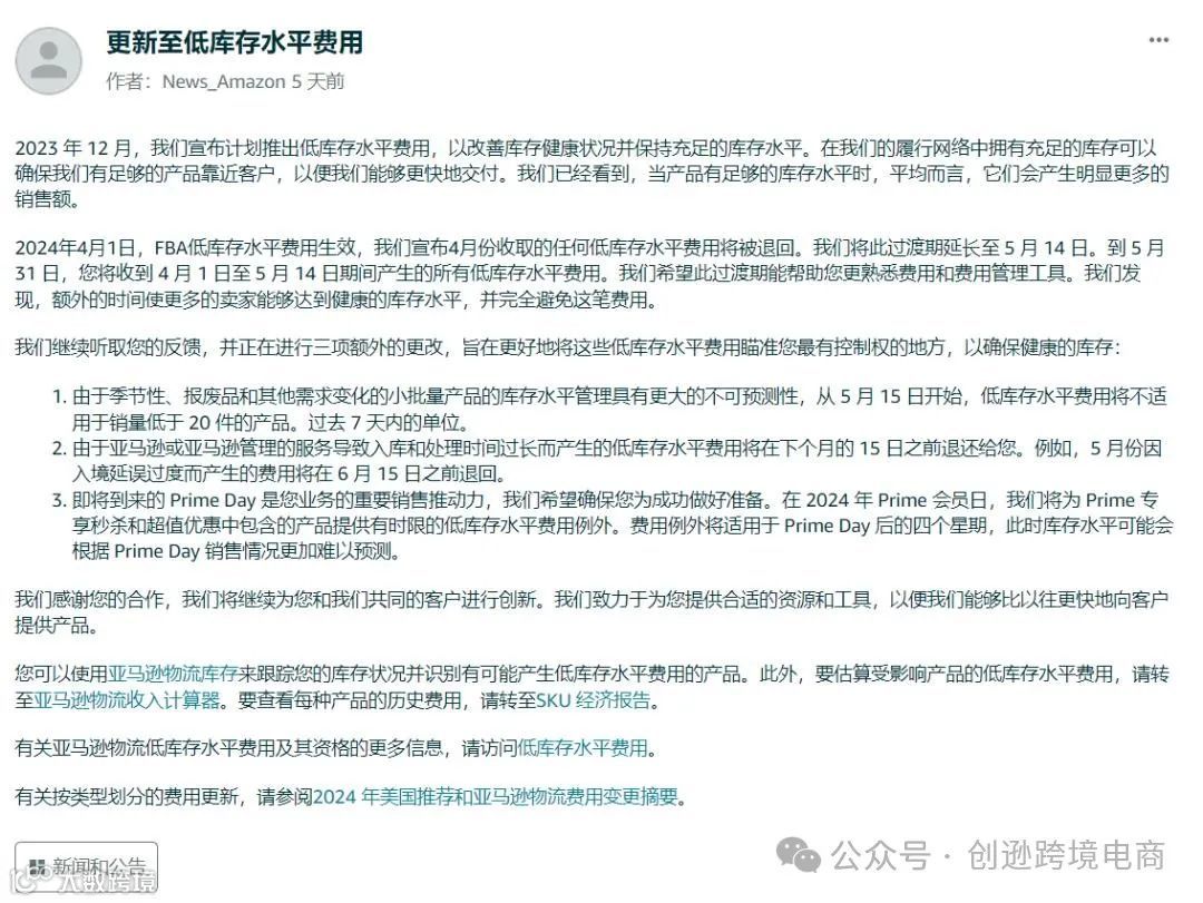 5月15日,亚马逊再次更新了低库存费用政策。主要内容如下: