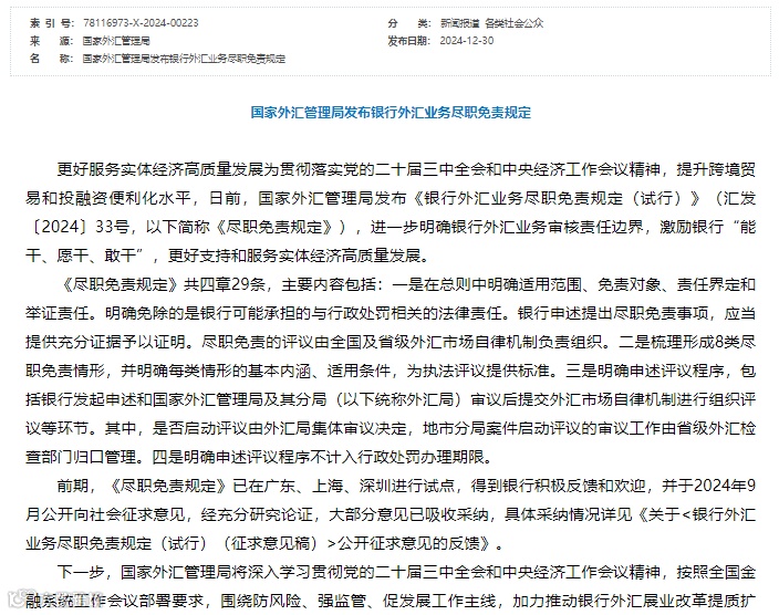 近期出台的三项配套法规文件,进一步细化了银行外汇业务的监管和风险管理。这些文件包括《银行外汇业务尽职免责规定(试行)》,该规定不仅明确了尽职免责的适用情形,还详细规定了申述评议流程,帮助银行更好地理清案件评议的标准与流程。此外,《银行外汇风险交易报告管理办法(试行)》和《银行外汇风险交易报告数据采集规范(试行)》则围绕外汇风险交易报告的具体要求进行了规范,推动银行建立健全外汇风险交易的监测体系。