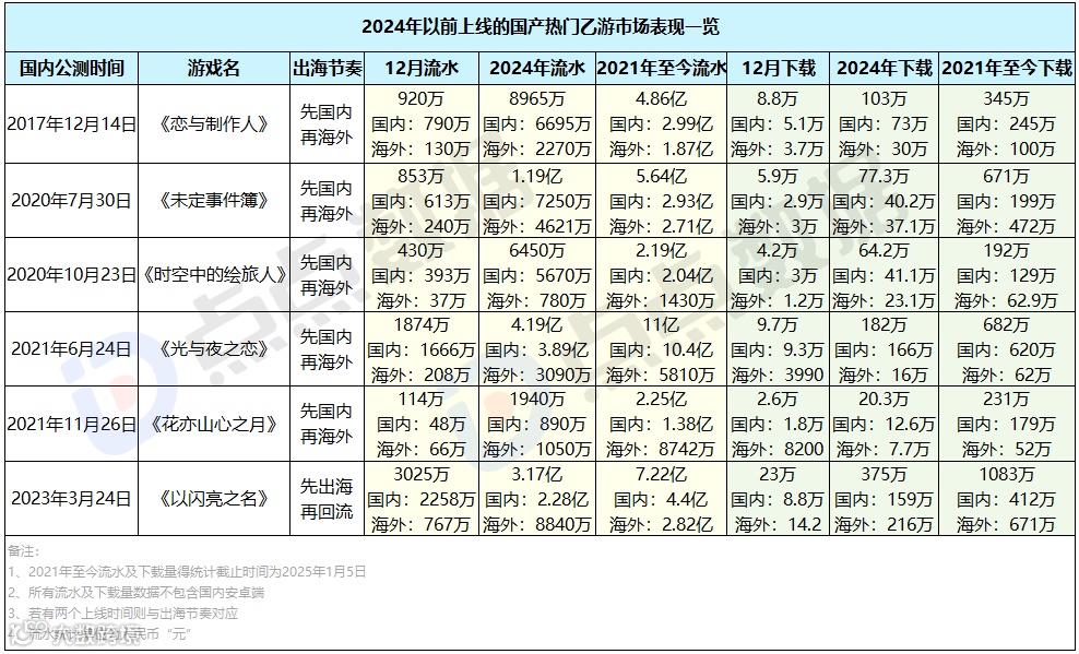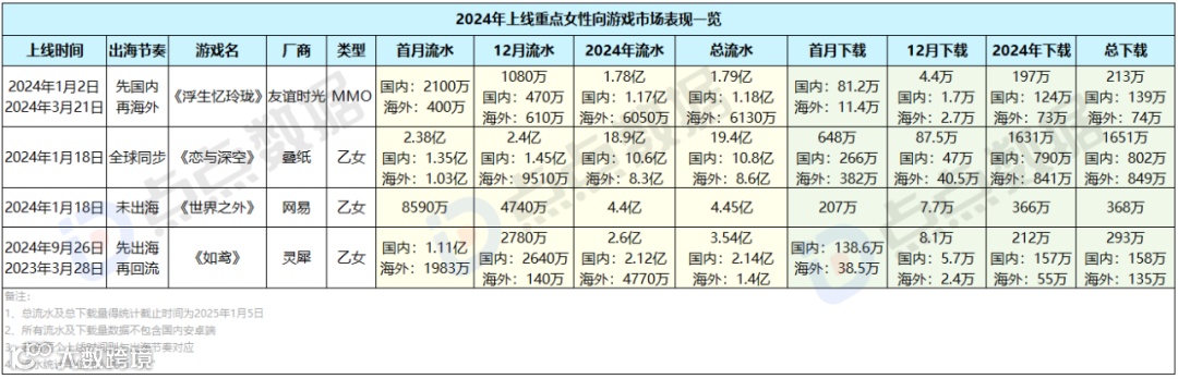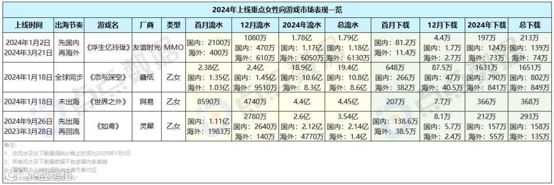 正如该部分开篇所说,乙女游戏出现爆款的概率极低,但今年似乎是个例外。在点点出海统计的2024年上线的重点女性向游戏中,有三款乙游”水灵灵”的冲上了头部的位置,其中还有两款在2024的年流水中超过了旧格局的王者《光与夜之恋》。