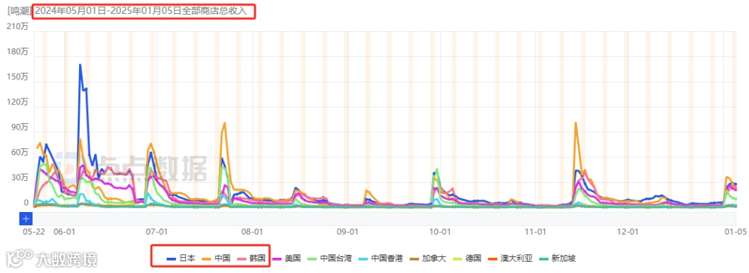 库洛旗下的《鸣潮》与《无限暖暖》一样都是今年新上线的开放世界游戏,前者于2024年5月开启公测,首月流水达4.65亿是后者的4.74倍,然而值得注意的是,两者在国服的首月流水几乎是一致的,都在7400万元左右,差距主要出在海外市场,《鸣潮》高达3.91亿,《无限暖暖》仅为2390万。