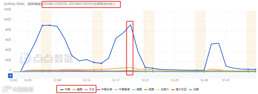 就流水而言(流水数据不包含国内安卓端,下同),公测当天吸金286万,表现较为一般,仅登上13个区域市场的iOS游戏畅销榜TOP100(其中位于中国第13、印尼第53、泰国62、加拿大第77等),3天后日下载下滑虽然明显但日流水增长至755万,之后游戏流水开始呈现大浮动震动,经历了多个波峰与波谷,日流在12月19日(公测两周)达到823万的峰值,但当前其日流已经回落到80万左右。