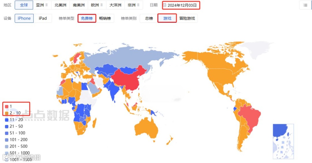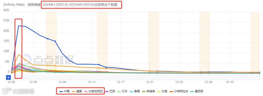 在全球3500万的预约基础上,12月2日《无限暖暖》在除中国大陆的多个区域市场Google Play端开放预下载,斩获13.7万下载量(下载量数据不包含国内安卓端,下同),次日预下载全面启动,当天便凭借82.1万的日下载峰值冲上108个国家及地区的iOS游戏免费榜TOP10(登顶中国、巴西、马来西亚、瑞典等13个区域市场),紧接着后一日的下载量有所下跌但依然有60.8万。预下载3天其累计下载量超156.6万,中国大陆市场占比为29.53%(46.2万)位列TOP1。