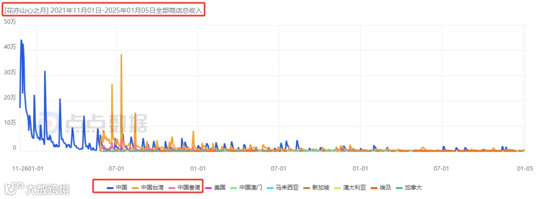 最后垫底的两款产品,一款是网易旗下2020年10月上线的《时空中的绘旅人》,游戏当前月流水为430万,2024年流水在6450万左右,其中国服贡献了87.9%。一款是朝夕光年旗下2021年11月上线的《花亦山心之月》,次年5月该作登陆海外140多个国家及地区,然而目前月流水已经低至114万,2024年的年流水仅为1940万,其中海外服占比为54%,是所有游戏中海外服占比唯一超过国服的。