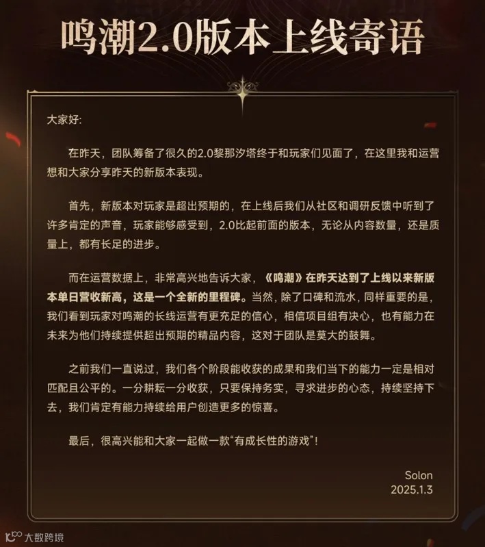 为了在年末拉高收入,本月2号游戏迎来了2.0大版本,次日制作人李松伦发布内部信表示,游戏在版本更新当天达到了日营收新高。据点点数据显示,之前该作移动端的单日流水最高出现在2024年6月6日约为3080万,而2.0版本当天日流水约为964万,后一个版本在移动端流水下降68.7%的情况下实现日流水新高,必然是因为PC与主机端的流水随着运营时长正在不断提高。
