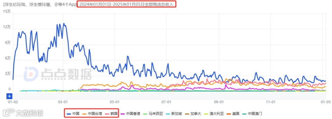友谊时光旗下《浮生忆玲珑》是2024年首款(1月2日)上线的女性向游戏,该作是爆款《浮生为卿歌》的续作,然而其首月国服iOS流水并不算亮眼仅为2100万,之后陆续上线美国、港澳台、韩国等市场。上个月游戏流水预估在1080万,其中海外服以56.5%的占比略高于国服,2024年其全球累计流水在1.78亿元,基本是新格局下的中位产品。