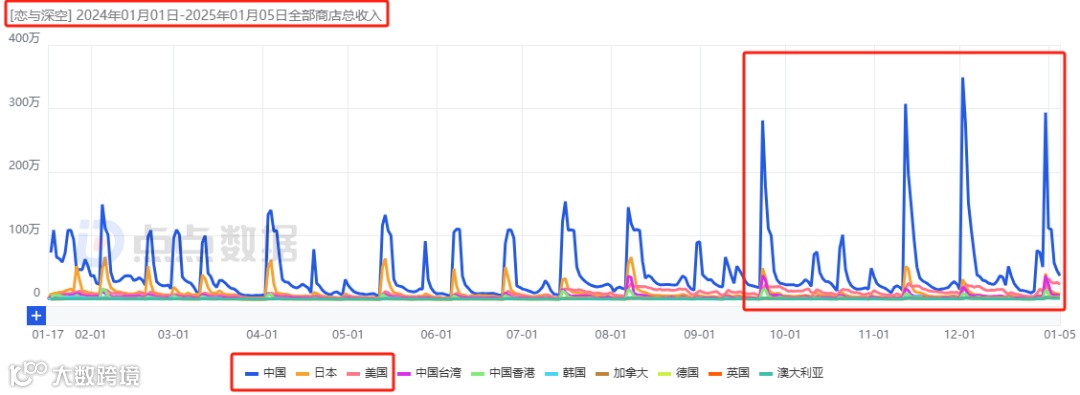 上个月,《恋与深空》的月流水达到上线以来最高点的2.4亿元,整个2024年其累计流水预估为18.9亿元,远超市场上所有的女性向游戏,其中国服占比55.73%,日本与美国紧随其后,占比分别为12.98%、12.1%,是极少数海外服与国服贡献几乎一致的游戏。