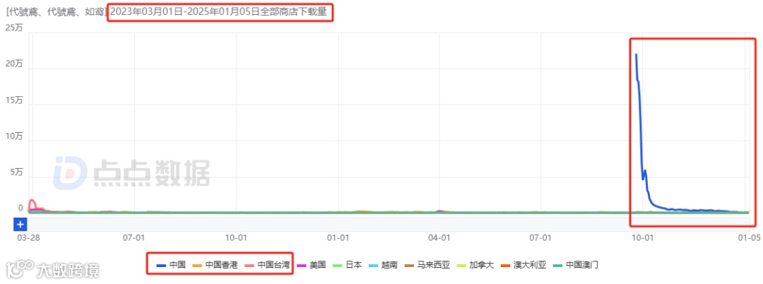 截止目前(2025年1月5日,下同),该作上线已经一个月,首月下载量预估在596万左右,中国、美国、印尼分别以29.91%、12.41%、4.72%的占比位列前三,T1市场中的日本和韩国仅贡献了3.79%与0.84%。