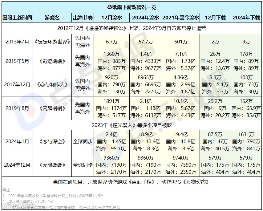 随着新游的加入,叠纸当前在运营的游戏有6款,今年这些游戏共计创造了超24亿的流水(不包含国内安卓端及PC、主机平台)。