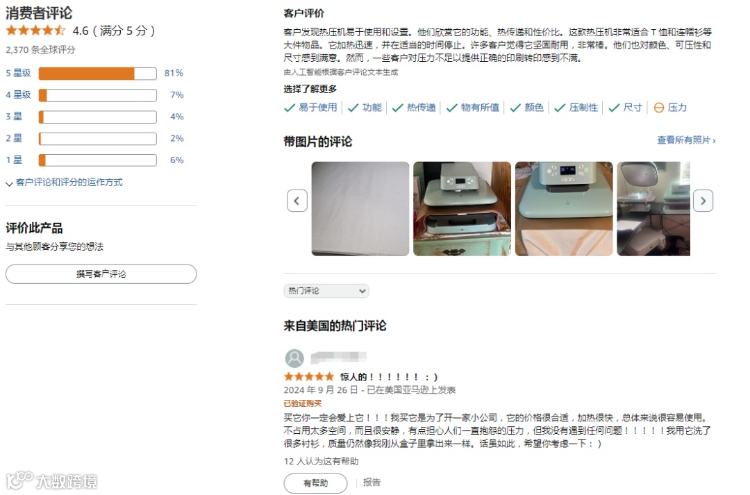周海峰选择的这种热压机售价亲民,操作简单,能够将各种DIY的创意图案印到帽子、T恤、桌布、鞋子等物品上,让用户享受到个性化创作的乐趣。其中一款迷你热压机还在亚马逊上获得了4.6分的评分及数千条评论,月销量超过千件。